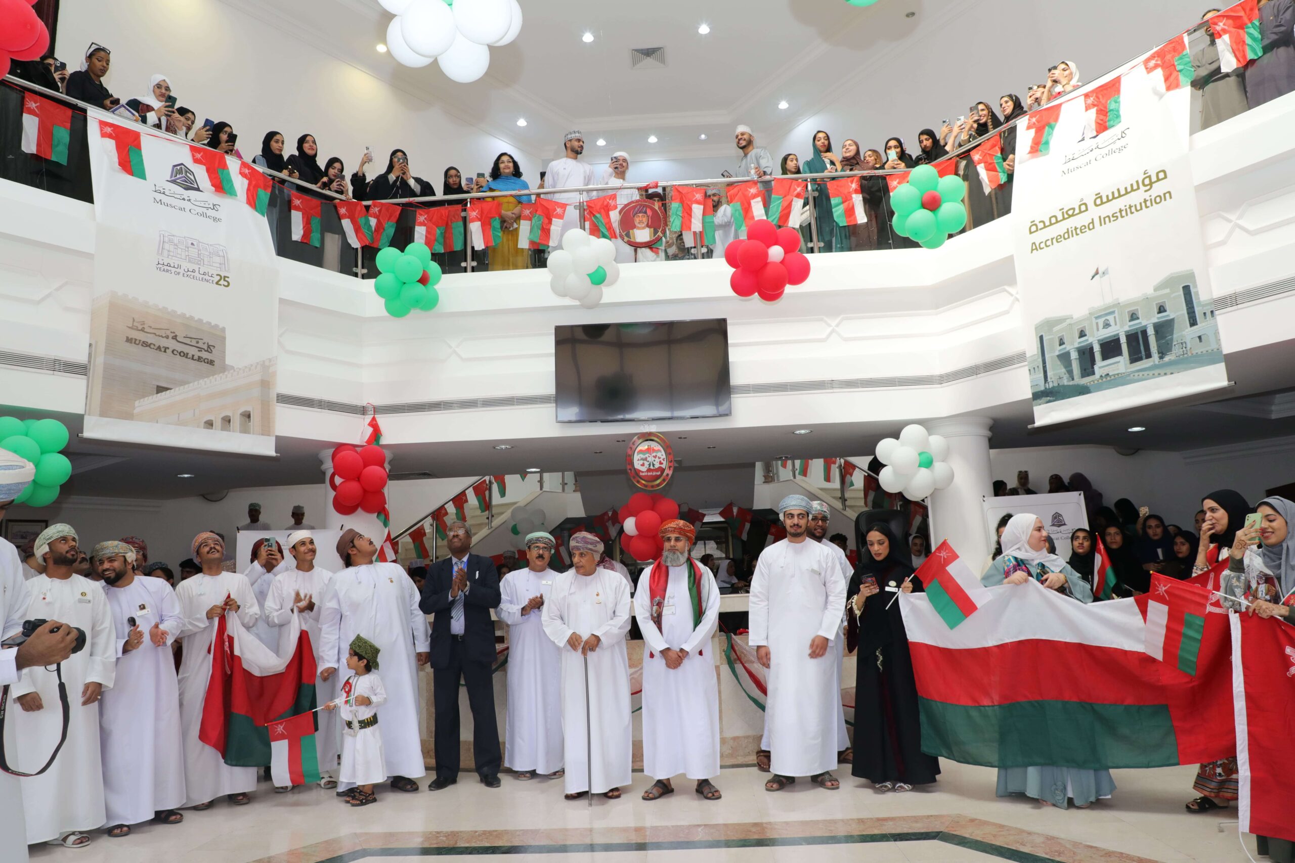Amid great joy and pride, Muscat College celebrated the 52nd Glorious National Day, where the students and the academic and administrative bodies formed a harmonious group of various activities, which lasted 4 hours, amidst love, cooperation and eagerness from everyone to express their happiness and belonging to this safe and generous country, where the activities began with a flag march, which It started inside the college campus and started in front of the sports hall and ended in the reception hall. Many male and female students and the administrative and academic bodies participated in it. The march was presented by the Dean of the College, Dr. With overwhelming joy, everyone arrived at the reception hall, and they were greeted by the president and founder of Muscat College, to receive from them the flag of the Sultanate and accept the flag with pride and reverence, and what a great position it was when everyone stood cheering the Royal Peace and carrying flags in celebration of the National Day. Student groups under the supervision of the Student Affairs and Graduate Follow-up Department The beginning was with the ranger clan and a scout tent that contained a lot of information about the rangers and their dazzling work and the most important things that distinguish the Omani mobile. It was joined by the pottery corner and the distinctive Omani products it carries. In addition to the work of the student groups, everyone toured the governorates exhibition organized by the Ambassadors of Hope group, which was organized by the Ambassadors of Hope group. It included many of the Sultanate’s governorates and what distinguishes each governorate, and the students competed to display the products of their governorates in a dazzling way and full of art and beauty to show everyone the extent of the nobility and originality of the governorates in the Sultanate. We do not forget the Omani corner for the college staff, where it was dominated by displaying the most important customs, traditions and foods that the Sultanate is famous for, which impressed admiration Everyone recalled the best memories and the activities of the day concluded in Al-Barza Hall, where the students celebrated and displayed their talents, which began with the artifacts of the Fine Arts Group, including a painting made of plastic bottle caps and some pins made in an innovative way from the colors of the Omani flag. Musical performances by the Royal Navy String Band Then a video was presented to the photographic groups, which contained footage of the faculty wearing the Omani dress under the supervision of the students. After that, the string band’s performances continued. The students of Muscat College presented a mixture of 4 Omani national songs that was designed specifically for the students of the college. It was implemented and recorded by the college students from the Musical Arts Group. In one of the studios known in the Sultanate, the theater group also presented a purposeful play entitled Who Will Come After Our Departure. The winning students at the end of the ceremony were the Al Hilal team and the Al Ittihad team. The ceremony concluded with a group of string band songs, which varied with famous songs in different languages, which won the admiration of the attendees. ".